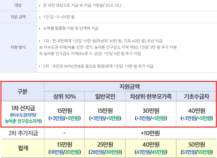 A1. 2025년 6월 18일 기준 대한민국 국민이라면 누구나 1차 지급 대상이며, 2차는 소득 상위 10% 제외 90%에게 지급됩니다.